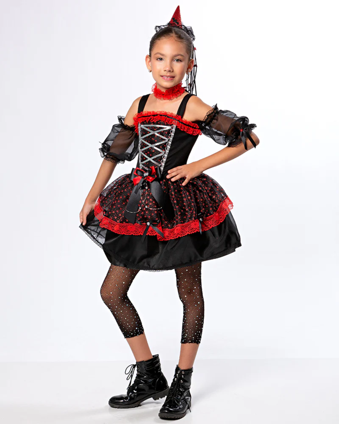 Vestido corpo malha com passa fita prata e detalhes de renda,manga bufante; saia organza preta com forro; sobressaia organza preta com brilho; renda e laços preto, laço cintura decorativo.