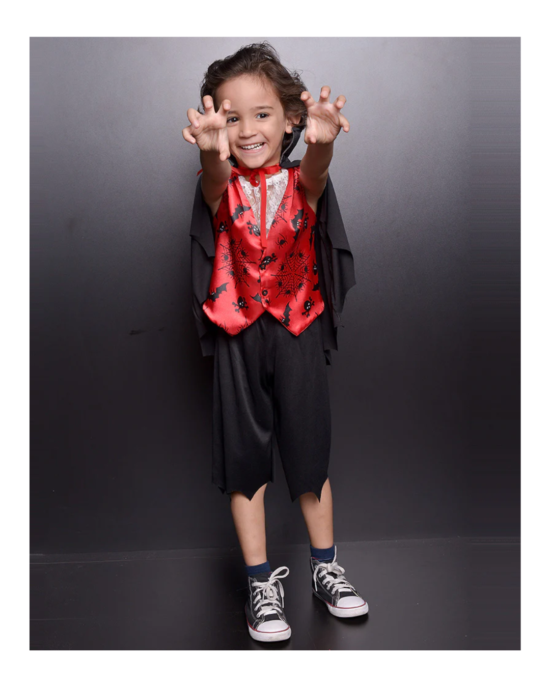 Bermuda malha repicada na barra e cintura de elástico; colete sem manga em cetim e desenhos preto; gola renda branca; capa preta.