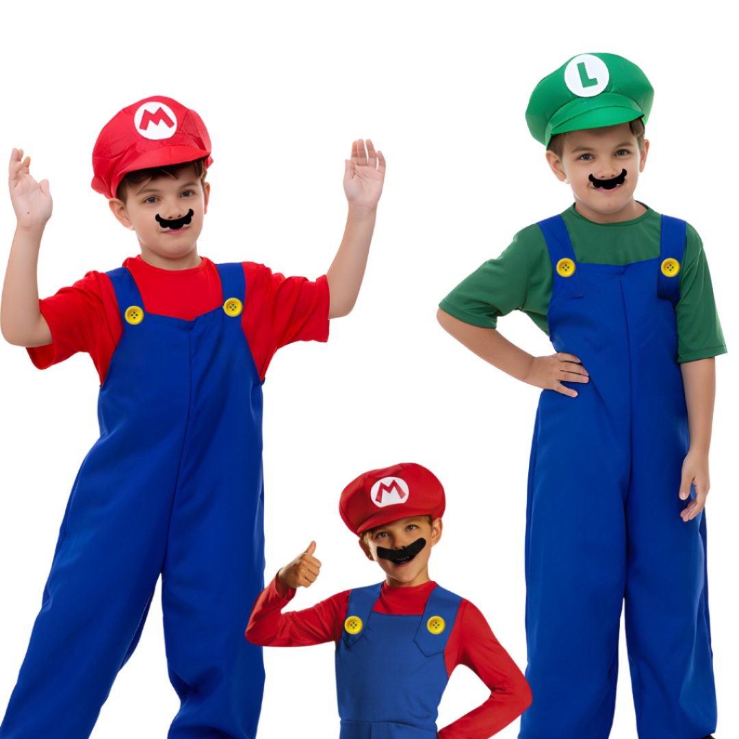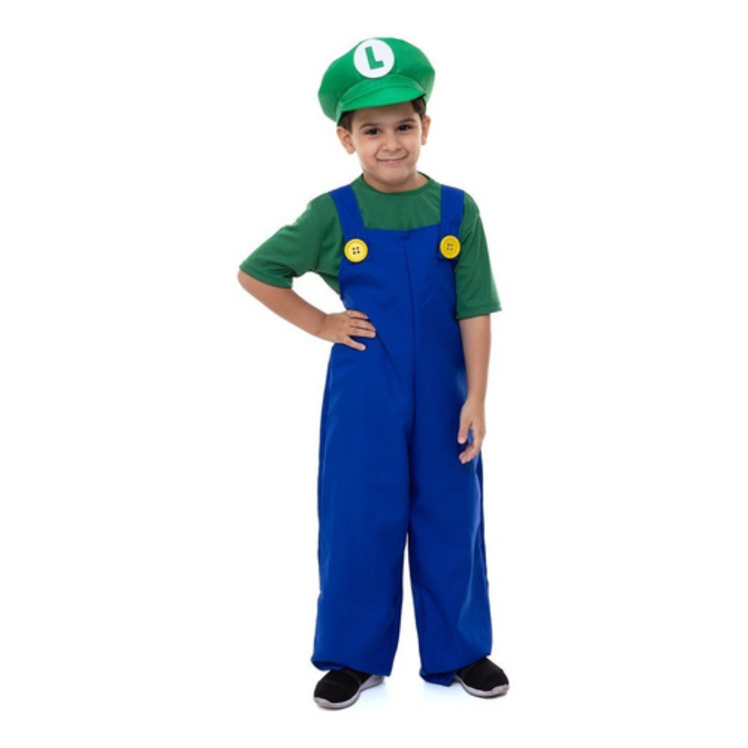 Macacão longo malha azul com botões amarelo, camiseta helanca verde, boné em malha e elástico, com emblema em feltro com a letra L. Acessórios vendidos separadamente.