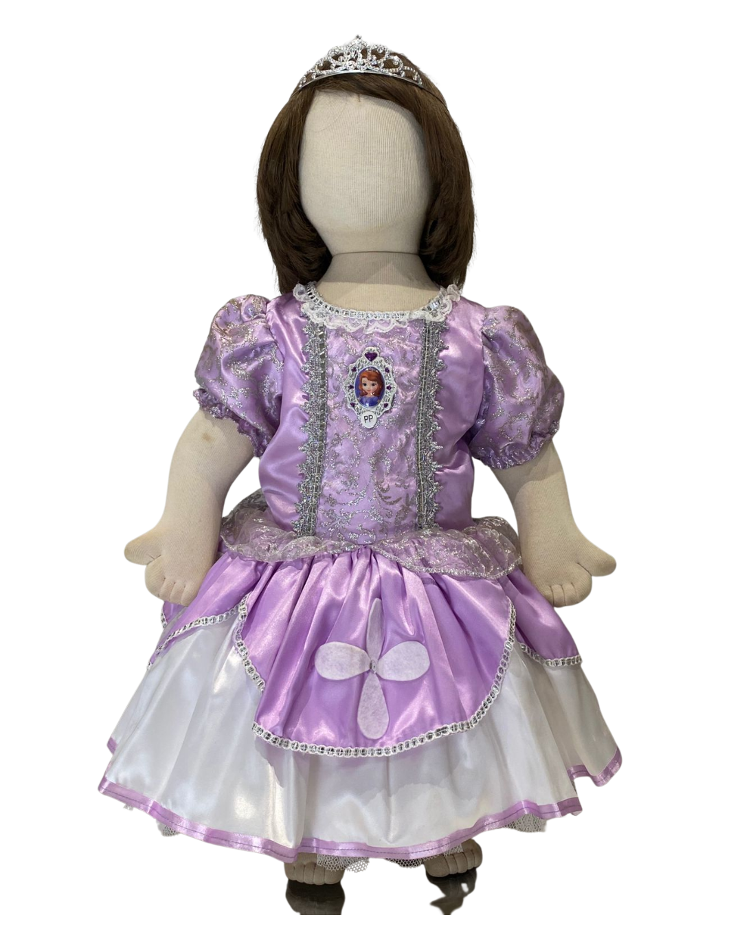 Vestido lilás com branco com desenho da Sophia, saia em babadoe e flores brancas em feltro.