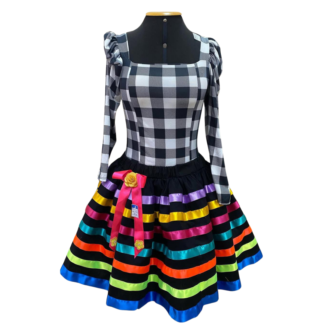 Saia tricoline preto médio franzida c/ fitas de cetim colorida e flor amarela c/ laço rosa neon, anágua filó preto e forro/
